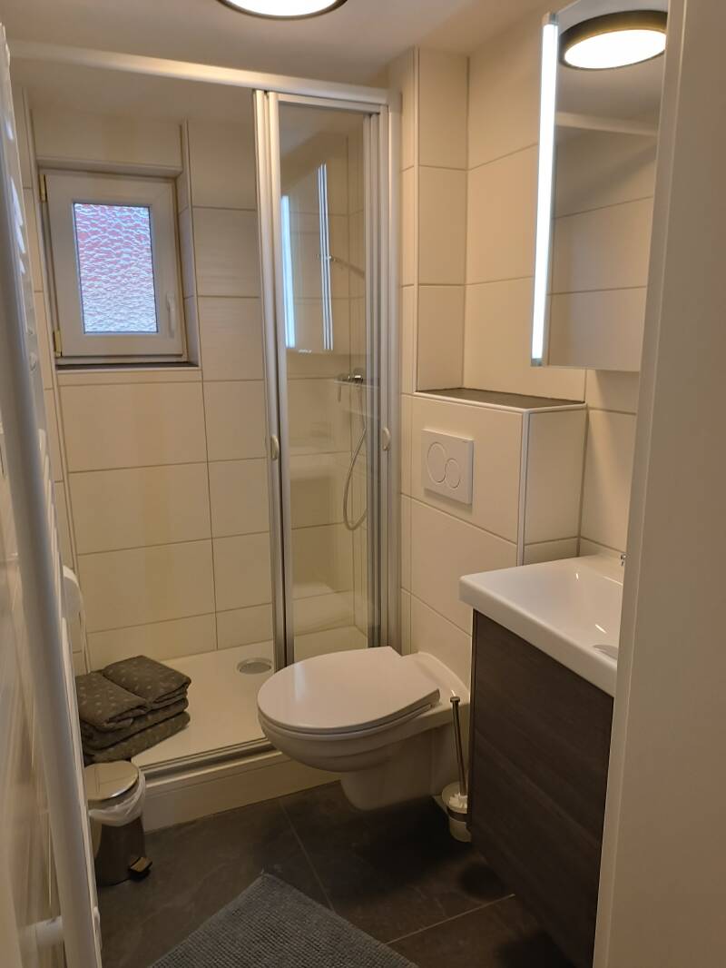 Duschbad im ersten Obergeschoss mit Handtüchern, Fön, Seife und Duschgel